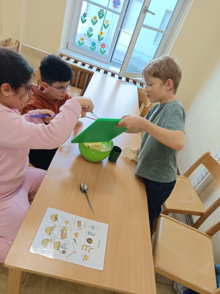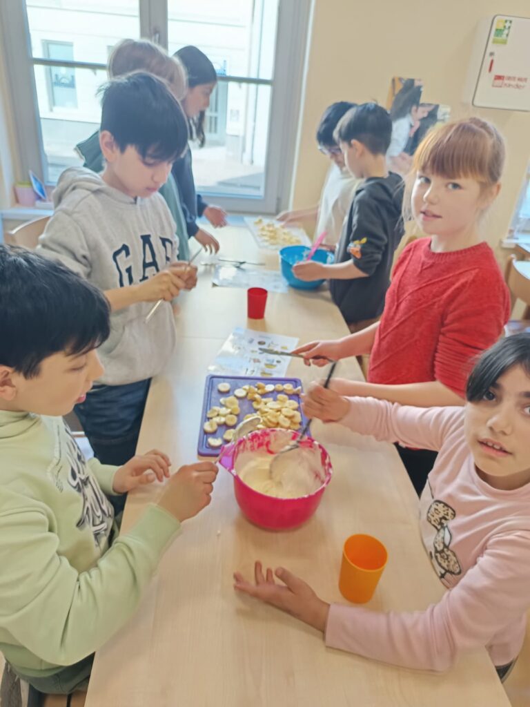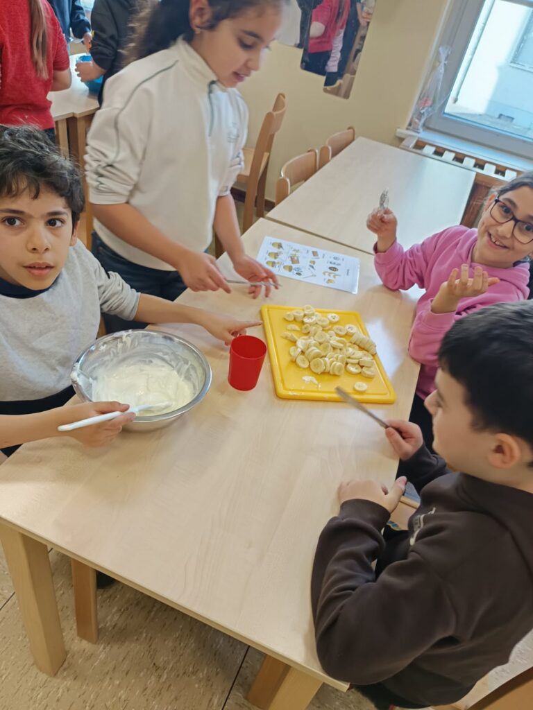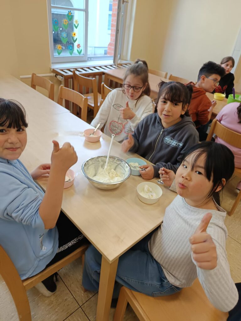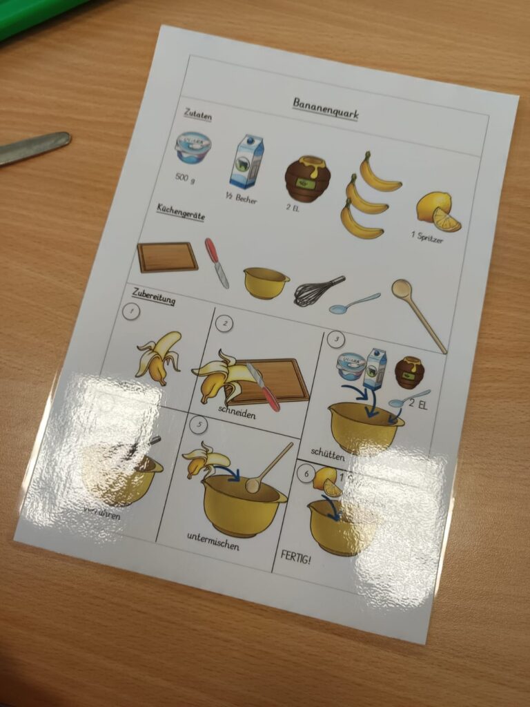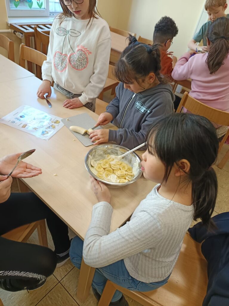 Passend zum Thema gesunde Ernährung, schreiben die Kinder der 3b im Deutschunterricht Rezepte. Heute haben die Kinder ein Rezept für Bananenquark in ihr Rezeptheft geschrieben. Anschließend wurde das Rezept gleich ausprobiert und der fertige Quark selbstverständlich sofort gegessen!